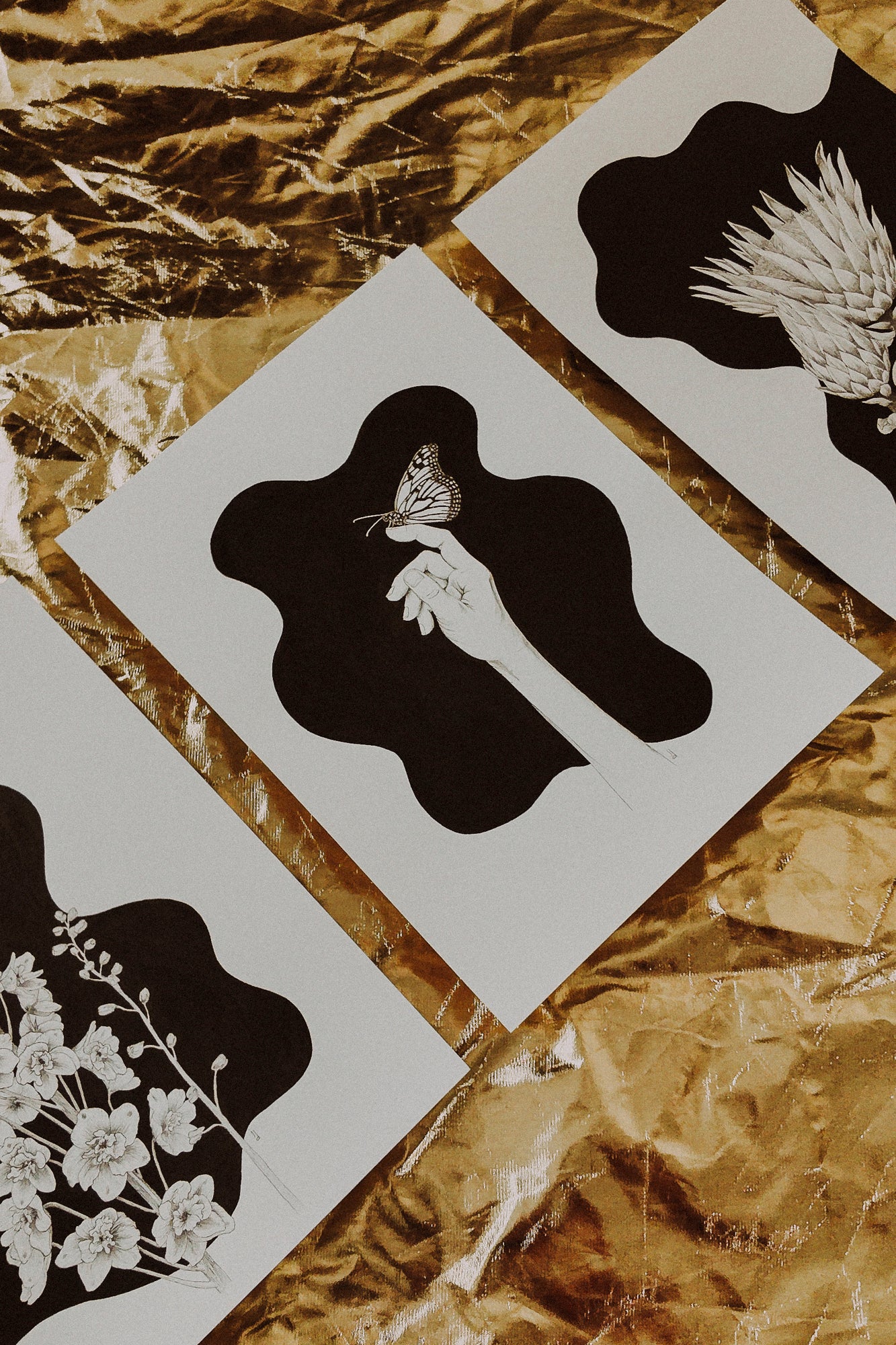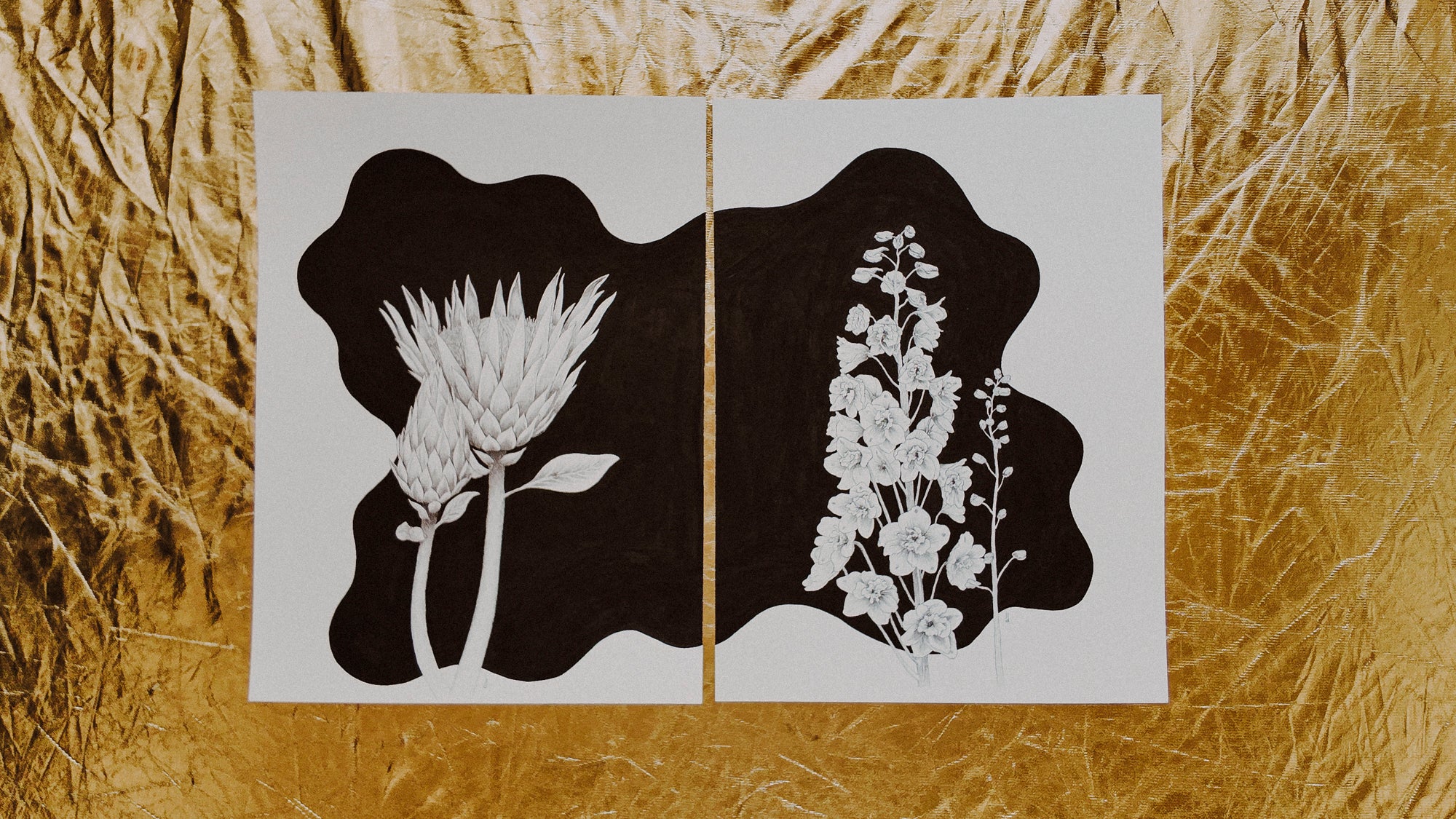 I read that the combination of a Larkspur flower and a Protea signifies that better days are ahead. I included their buds in their respective pieces as a reminder of their passing stages; of the beauty of unrealized potential and the pain of waiting for something to bloom.