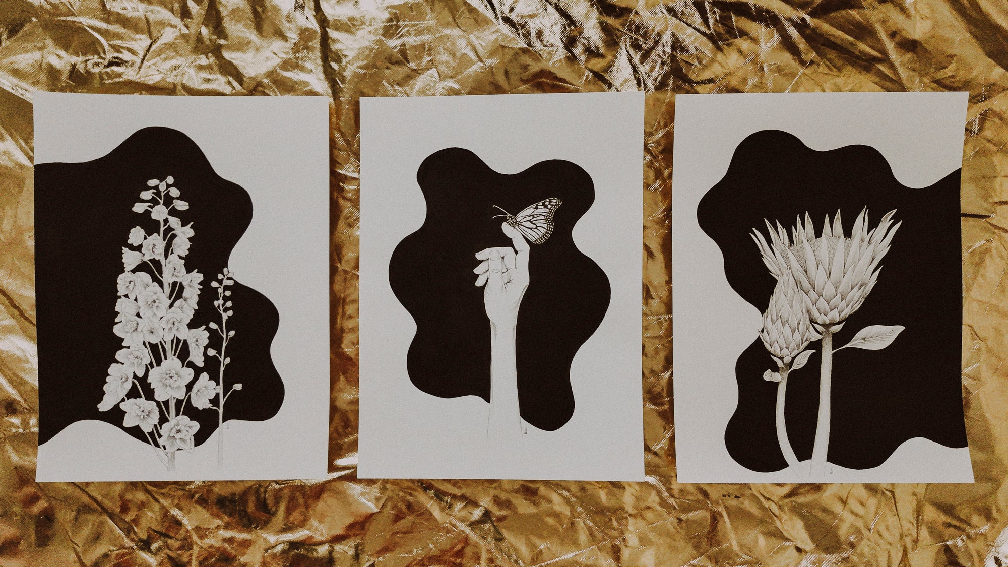 Typically, one piece of art will take 15-20+ hours to create. I faced multiple setbacks in this series, including my camera falling on and damaging the first sketch of the Protea (which I had spent 7 hours on). Then, the initial ink blob shape around the Protea and the Larkspur that I made looked horrible when I was done. Luckily, I was able to fix it and am much happier with the blobby-ness of the updated shapes.